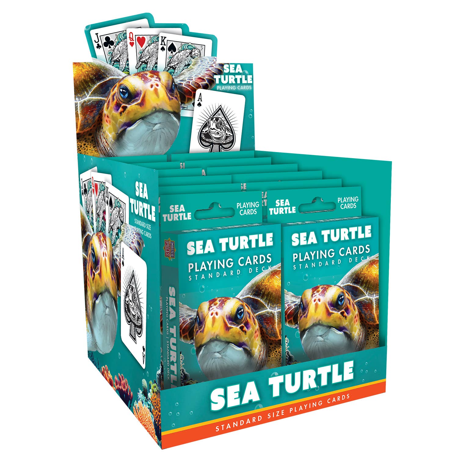 Make waves at game night with these Sea Turtle Playing Cards by Masterpieces! This standard 52-card deck (plus 2 jokers) is anything but ordinary. Each card showcases unique sea turtle-themed illustrations showcasing the grace and beauty of these gentle marine creatures. All the number cards feature a fascinating sea turtle fact or way to help sea turtles that'll surprise and delight players of all ages. From nesting behaviors to migration patterns—making every hand both fun and educational. Whether you're playing classic card games or teaching new ones, these cards are sure to be a hit with fans of all ages. Perfect for marine life lovers, students, educators, and anyone who enjoys a fresh take on traditional card games. Shuffle into the sea – one card at a time. Did you know that turtle eggs increase nutrients on beaches?
