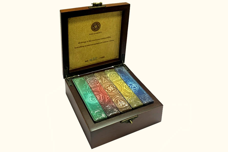 Five decks of cards are quietly displayed inside the box. The patterns at the bottom of the deck work together to form a continuous and interrelated matrix from which the magic of the mysterious five elements seems ready to burst.