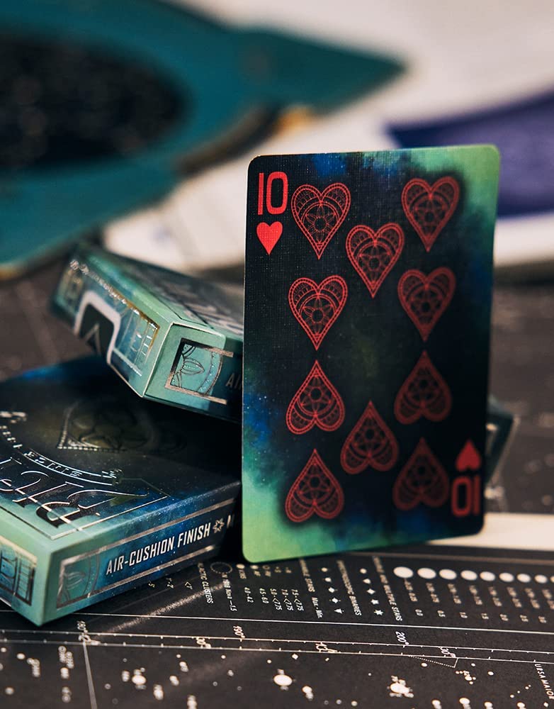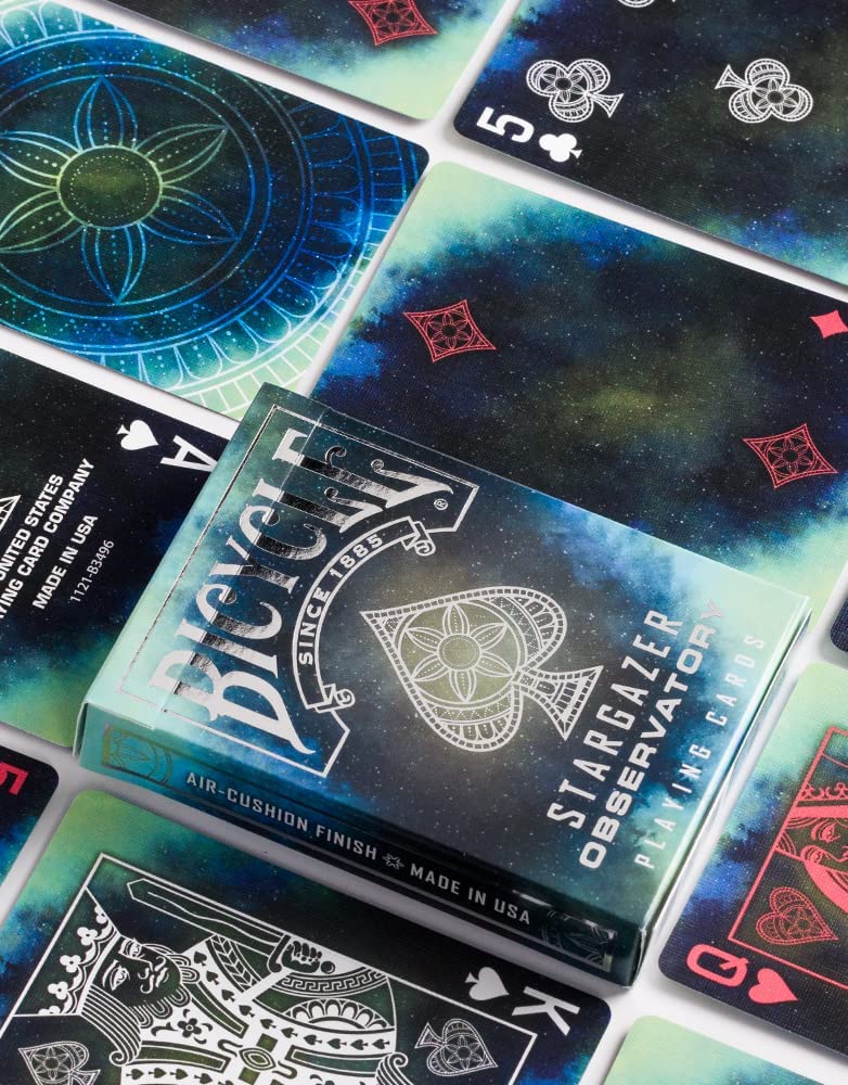 Bicycle Stargazer Observatory playing cards are the latest addition to the space-themed Bicycle Stargazer collection. The Bicycle Stargazer Observatory playing cards design was inspired by constellations and sacred geometry. The tuck box and card back feature the hues and colors from the depths of the galaxy. Like the rest of the Stargazer collection, this deck includes premium foil packaging on the tuck, showcasing beautiful silver foil accents. The card faces feature intricate custom pips and contrasting suits to aid playability for your favorite card games.