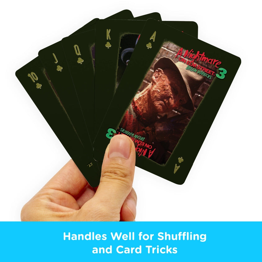 A Nightmare on Elm Street Playing Cards A NIGHTMARE ON ELM STREET DECK OF PLAYING CARDS: Play your favorite card games with Friends and Family and dream of Freddy Krueger with this official deck of a Nightmare on Elm Street playing cards UNIQUE DESIGN ON EVERY CARD: This A Nightmare on Elm Street deck of playing cards includes 54 cards (52 playing cards and 2 jokers). Every single playing card features its own distinct NOES themed design and art. No two cards are alike LOOKING FOR NIGHTMARE ON ELM STREET GIFTS? This NOES deck of cards is the ultimate gift for NOES fans. Perfect for game night, birthdays, stocking stuffers, white elephant, and Holiday gifts, that everyone will absolutely love receiving as a gift 100% OFFICIALLY LICENSED A NIGHTMARE ON ELM STREET MERCHANDISE: This deck of NOES playing cards is designed by AQUARIUS and officially authorized by Warner Brothers. They're the perfect piece of NOES memorabilia to add to your collection