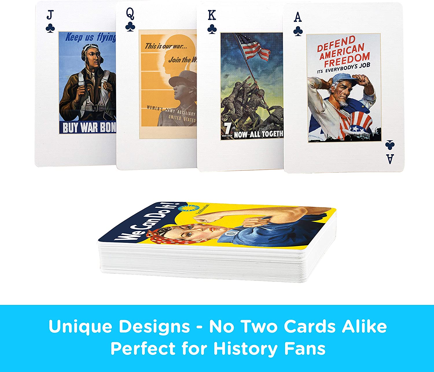 UNIQUE DESIGN ON EVERY CARD: This Smithsonian deck of playing cards includes 54 cards (52 playing cards and 2 jokers). Every single playing card features its own distinct War Posters design and art. No two cards are alike