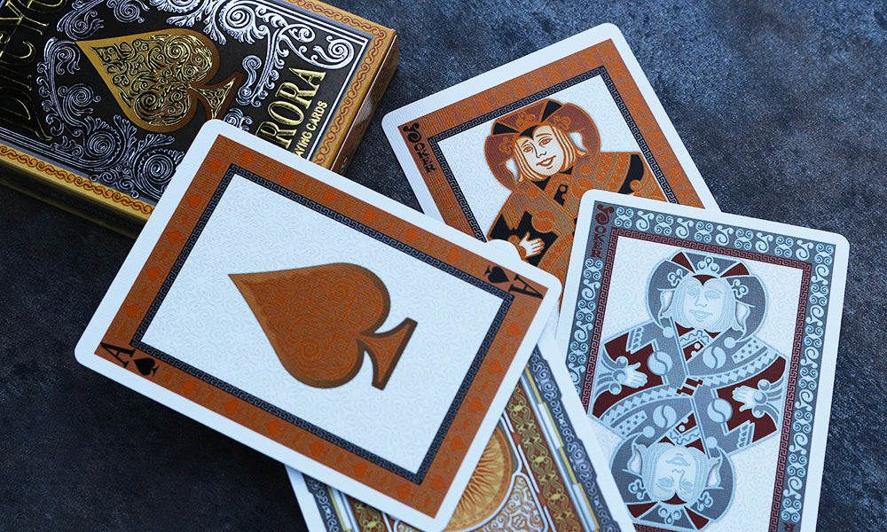 Feast your eyes on The Aurora deck created with a gold foil embossed tuck case and each card printed with metallic inks. The Aurora is a great display piece for any card collection. Art work by Johnny Whaam and printed by USPCC.