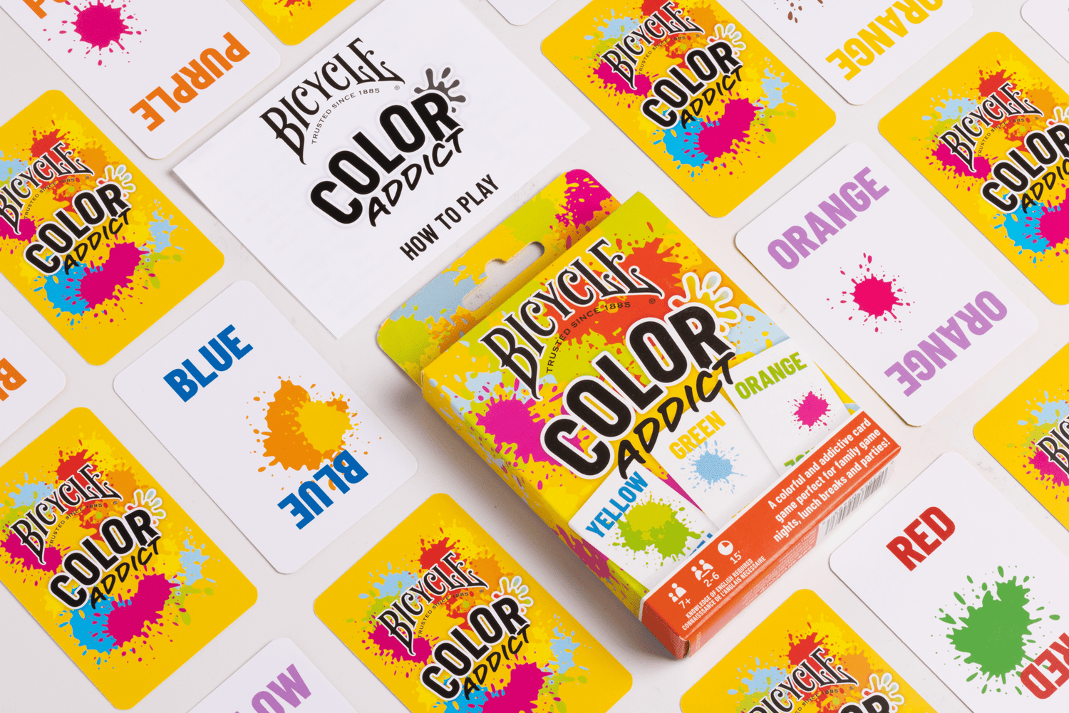 Color Addict es una tarjeta fácil de aprender y divertida de jugar para personas de todas las edades. El juego se basa en una anomalía psicológica llamada Efecto Stroop, que demuestra que cuando el nombre de un color se escribe en un color diferente, es más difícil nombrar el color en el que está escrito. ¡El resultado es un juego de diversión alucinante! Hay 110 tarjetas donde los nombres de los colores están escritos en un color que no necesariamente coincide. El objetivo es ser el primero en deshacerse de todas las cartas en tu mano.
