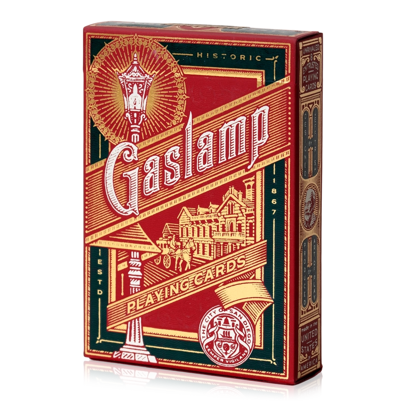 Los naipes Gaslamp son un tributo al histórico Gaslamp Quarter en San Diego, California, y celebran las hermosas características victorianas y el pasado ecléctico del distrito. Jeff Trish los ilustra con un estilo que recuerda al grabado lineal del siglo XIX con detalles intrincados y sutiles toques de folclore en todas partes.