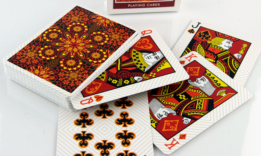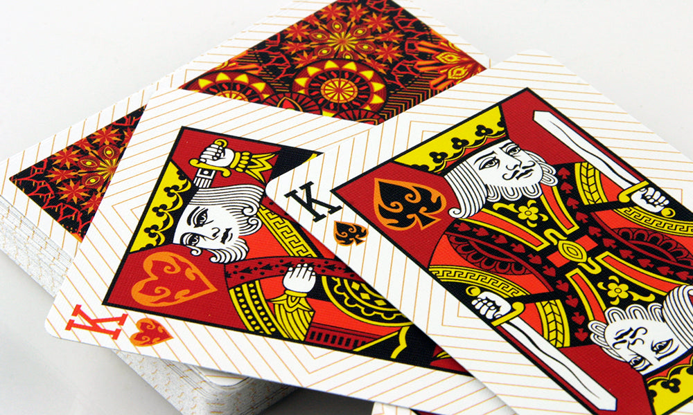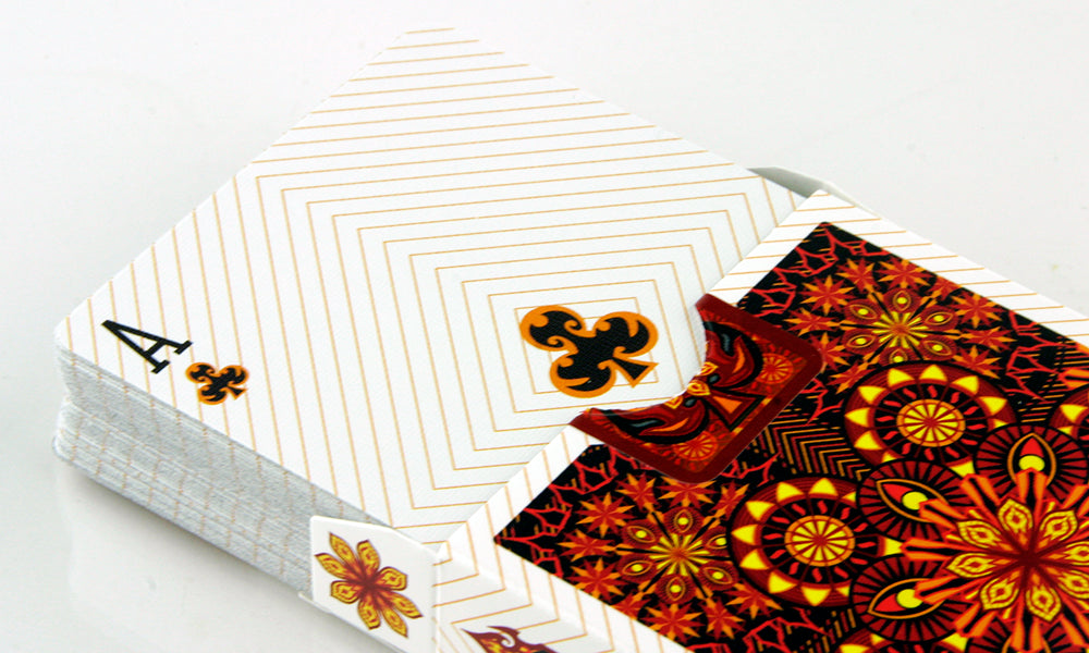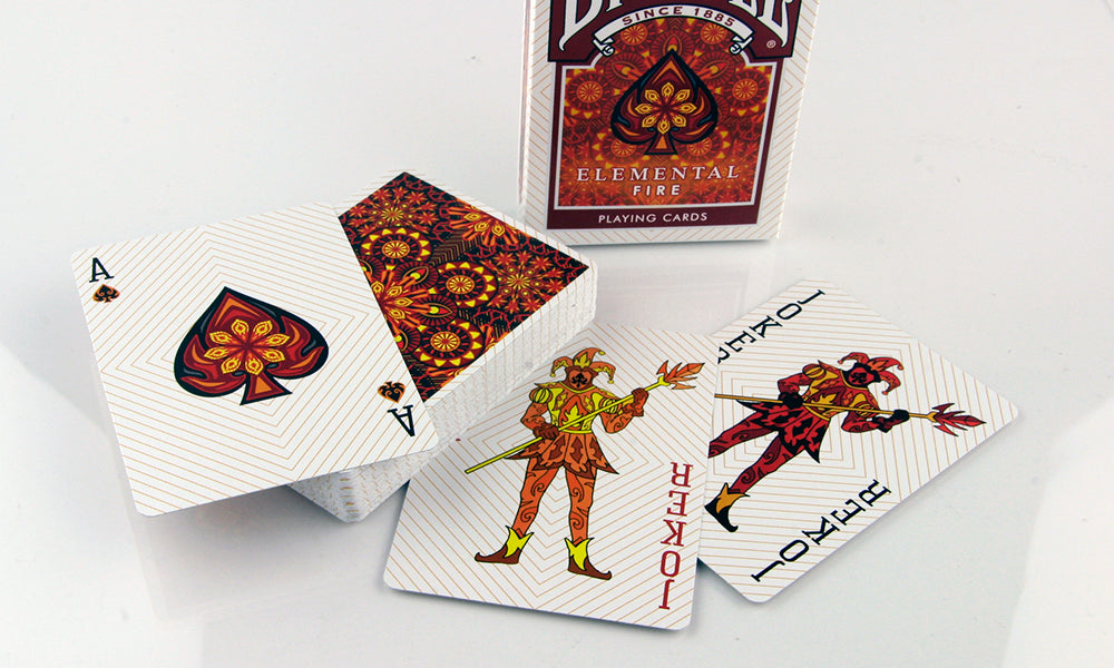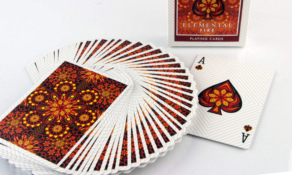 Las barajas Tierra, Viento, Fuego y Agua de Collectable Playing Cards son los Elementos más famosos. Estos elementos son los que nos trajeron aquí y los que nos mantienen vivos. Cada uno se entrelaza entre sí. Uno no puede vivir sin el otro. Asegúrate de poseer toda la colección para poder sobrevivir. Impreso por la USPCC. El diseño estampado junto con cada color le dan a estas tarjetas una sensación terrenal. El reverso de estas cartas tiene un bonito abanico y un diseño caleidoscópico.
