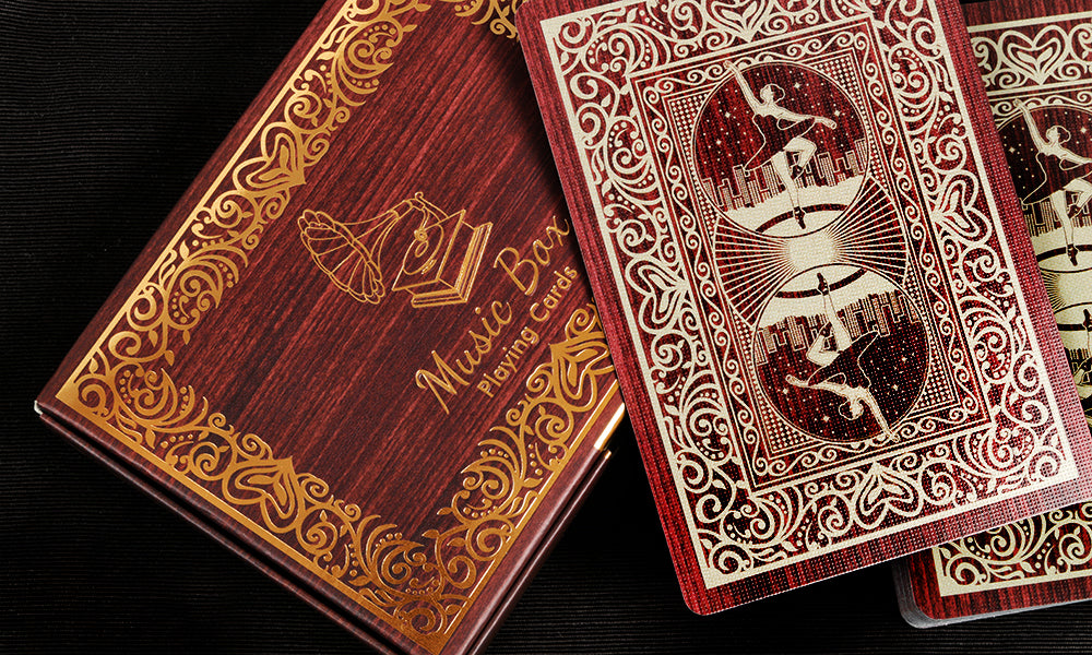 ¡La Music Box Deck personalizada con lámina dorada se ve y suena como una caja de música antigua real! Un diseño revolucionario de estuche se abre desde la parte superior y, una vez abierto, una suave y hermosa melodía te saluda. La canción es "Claire De Lune" y fue grabada usando un peine de metal golpeando contra dientes de metal dándole el sonido genuino de una caja de música. La duración de la canción es de 30 segundos.