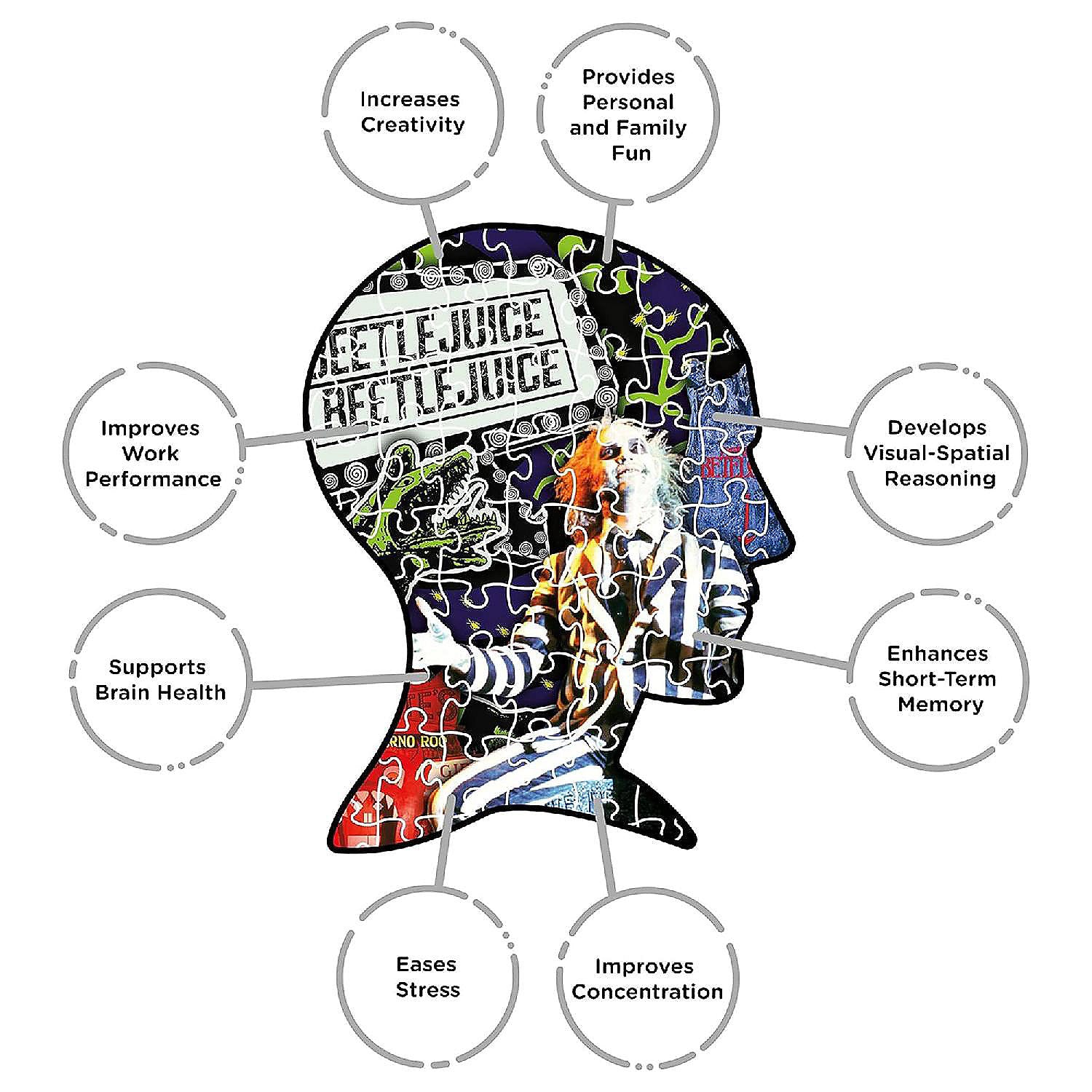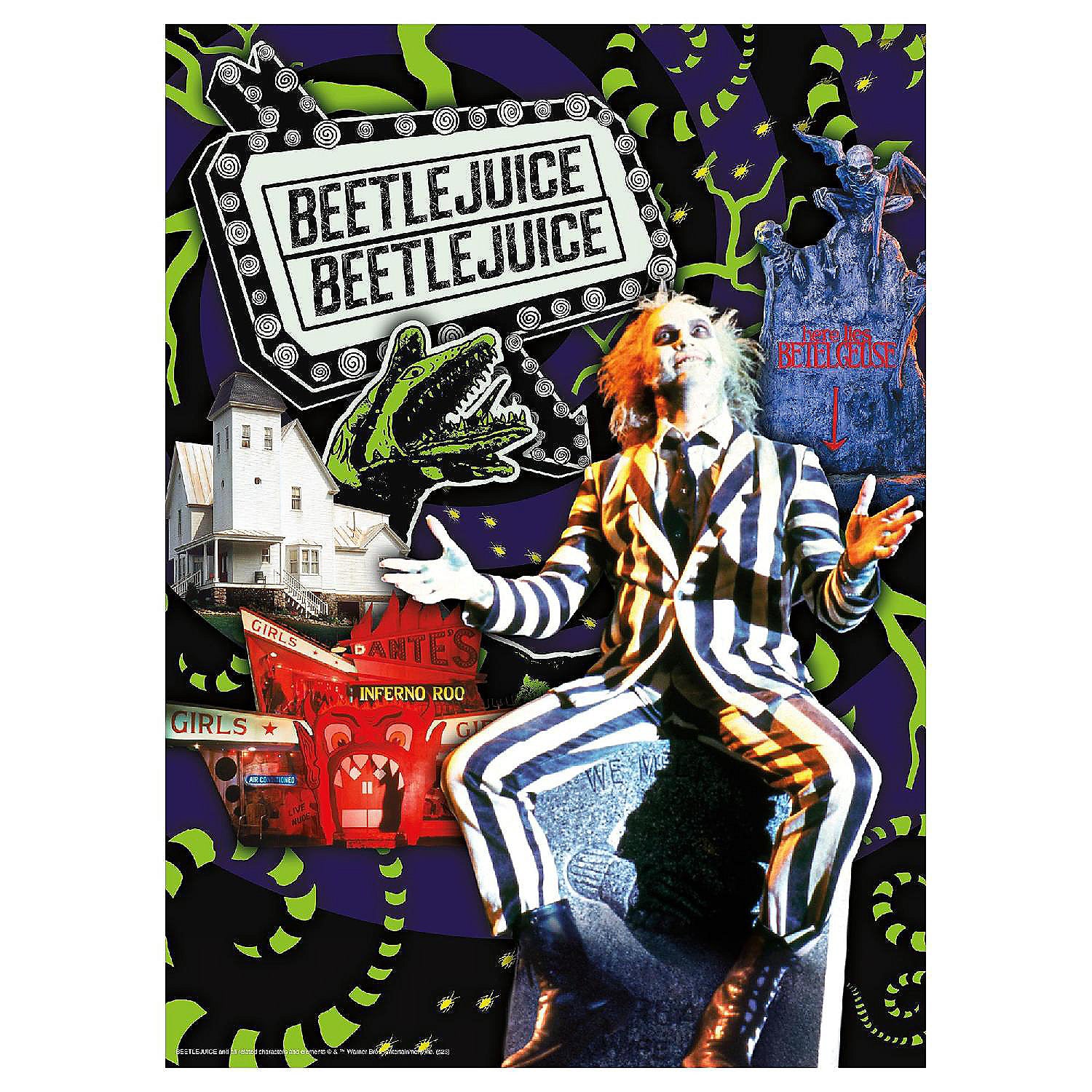 Enjoy piecing together this 500 piece puzzle featuring a chilling image from Beetlejuice! It measures 14" x 19" when completed and comes in a coffin shaped box with a bonus poster of the image.