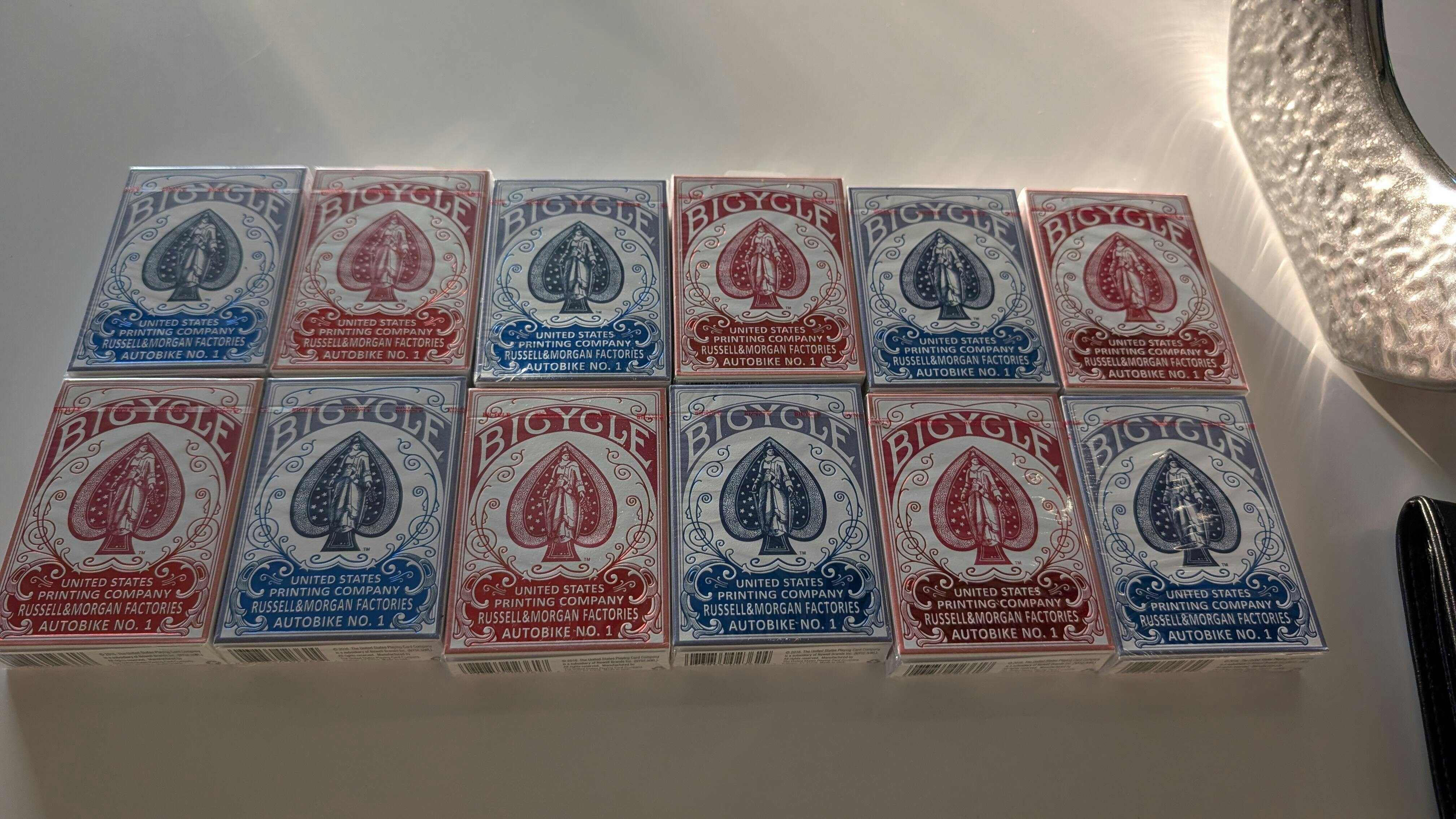 The original deck was printed from 1902 to 1906 and produced only in red and blue colors. The tuck and back designs illustrate the intricate style of the early Bicycle and Russell & Morgan brands.
