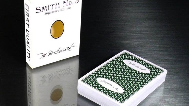 The signature, of M.D. Smith, was carefully recreated from an old signed copy found in the Conjuring Arts Research Center's private collection. The Ace of Spades has a rendering of Mr. Smith's face and the tuck has a die cut hole so you can see Mr. Smith while the deck is closed.